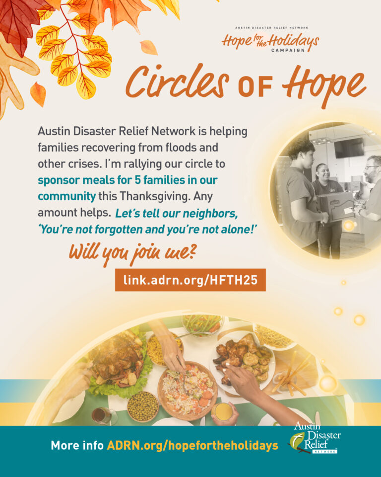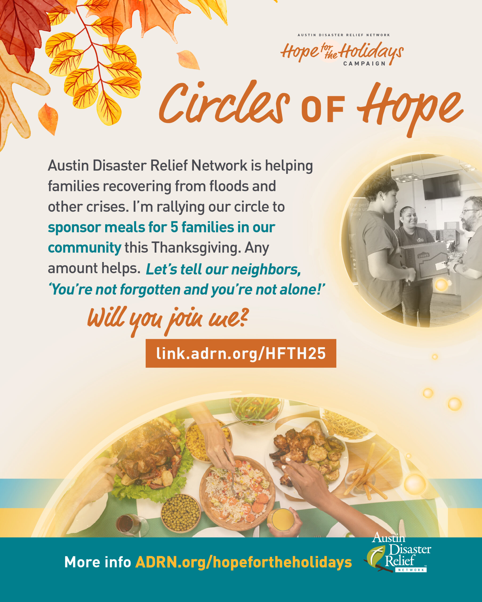Austin Disaster Relief Network is helping families recovering from floods and other crises. I’m rallying our circle to sponsor meals for 5 families in our community this Thanksgiving. Any amount helps. Let’s tell our neighbors, ‘You’re not forgotten and you’re not alone!’ Will you join me?